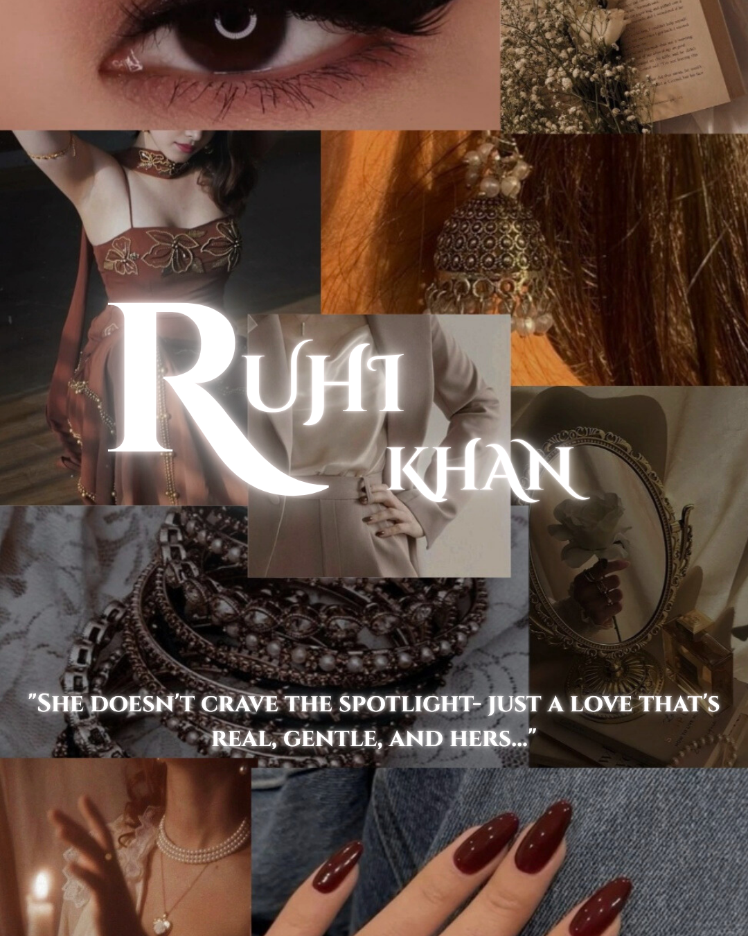 Ruhi Khan — soft, clumsy, and emotionally honest. She struggles to express herself confidently, often overthinking her words and actions. Ruhi loves with purity and sincerity, never casually. She is gentle in conversations and careful with feelings, especially her own. While she appears quiet, her emotions run deep, making her vulnerable but genuine.